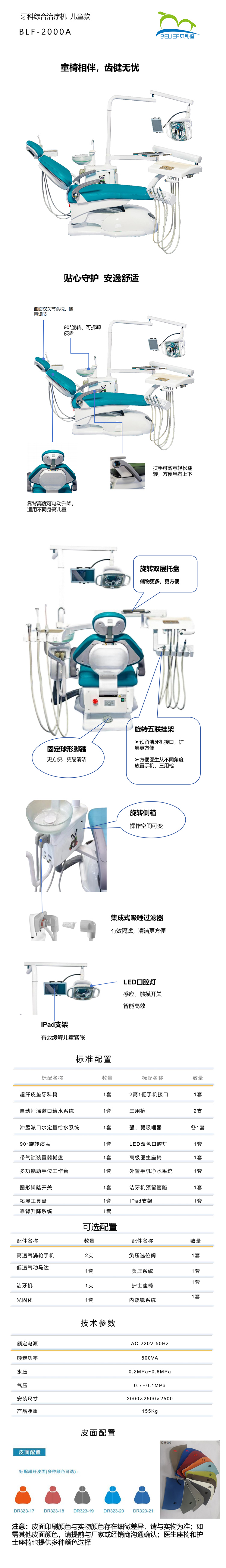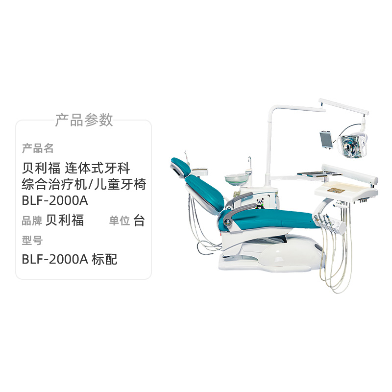 贝利福 连体式牙科综合治疗机/儿童牙椅BLF-2000A商品编号:2910157001 (注意:“安装费和物流上门费需另外计算,具体购买情况请咨询客服”该产品不能使用优惠券;7个工作日内发货,非质量问题不退不换;坐垫颜色可选,下单请留言;主机及配件保修期一年)