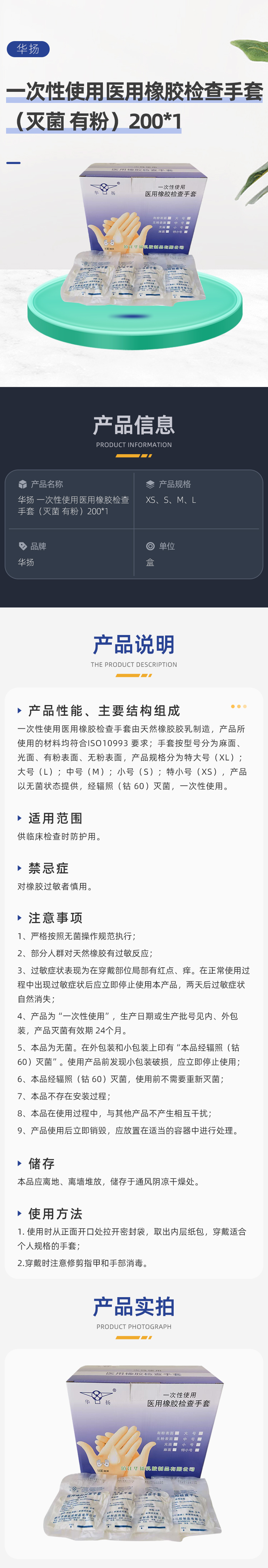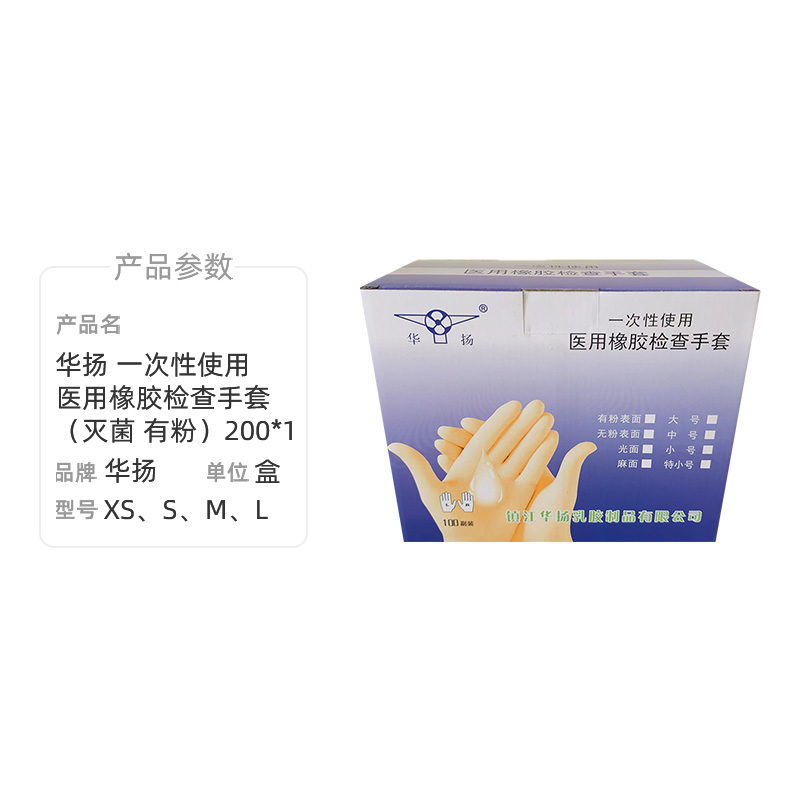 华扬医疗 华扬 一次性使用医用橡胶检查手套(灭菌 有粉)200*1商品编号: