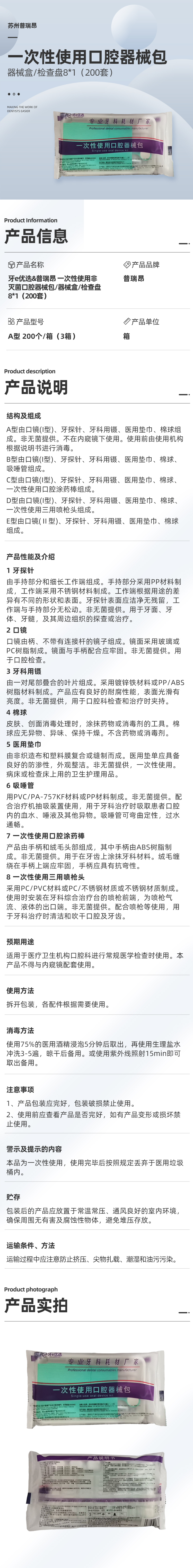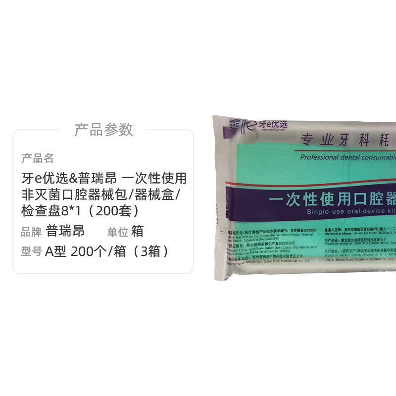 苏州普瑞昂 牙e优选&普瑞昂 一次性使用非灭菌口腔器械包/器械盒/检查盘8*1(200套)商品编号: