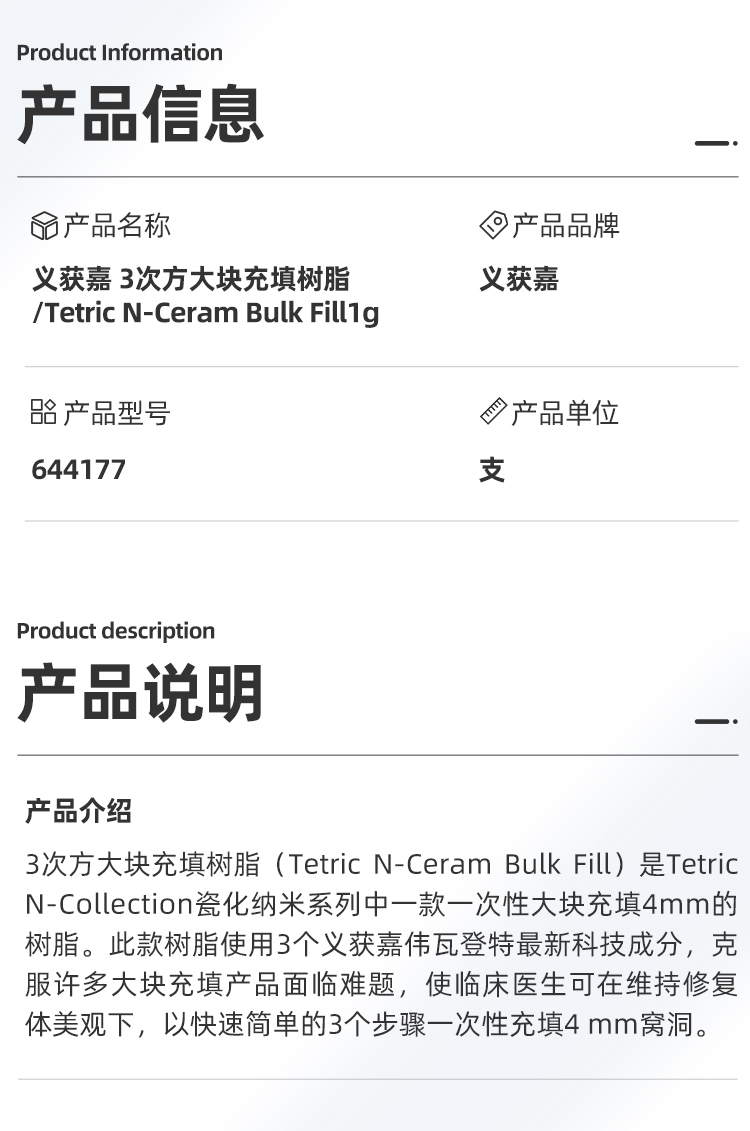义获嘉 3次方大块树脂/加厚型纳米瓷化树脂Tetric N-Ceram Bulk Fill 1g商品编号:8700027001 (大块可塑形,一次充填7mm;可选颜色,可做牙釉质充填)